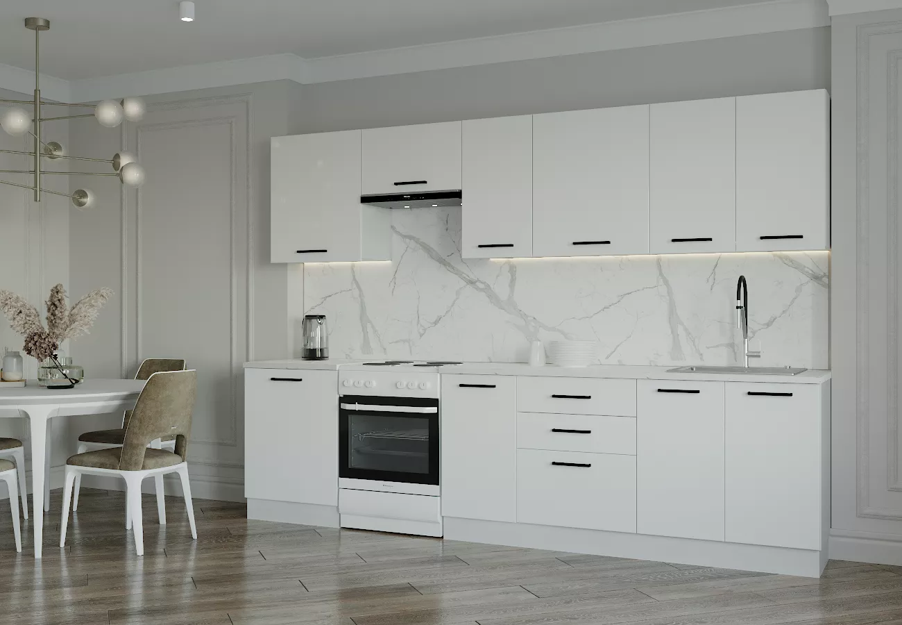 Фасады верхних модулей со свесом 12 мм дают возможность использовать без установки ручек.