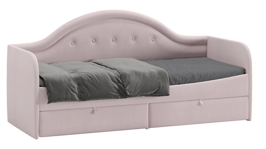Благодаря своей конструкции, отлично разместится вдоль стены, экономя пространство. Днем это замечательный диванчик, а ночью – спальное место.ьКровать имеет мягкую обивку не только спинки, но и остальных внешних деталей. В детской спальне или малогабаритной квартире столкновения с мебелью просто неизбежны. Мягкая обивка кровати смягчит такие моменты и уменьшит травмоопасность.