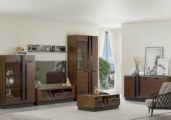 Многофункциональный шкаф-витрина из коллекции "Магнолия" имеет отделением с полками и выдвижной штангой за глухой распашной дверцей, в котором удобно хранить одежду. Отделение со стеклополками за частично застекленной распашной дверцей можно использовать как витрину для посуды или сувениров. Декор "лакобель", фрезеровка фасадов и контрастные ручки подчеркивают стиль коллекции.