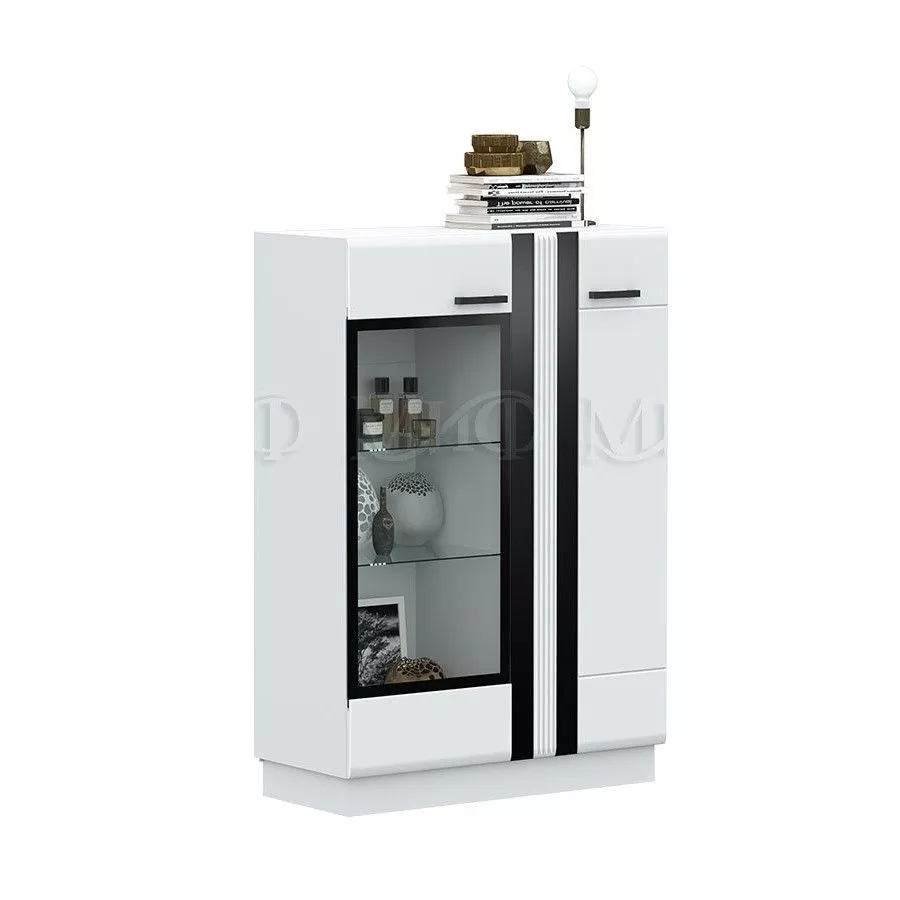 Невысокий шкаф-витрина из коллекции "Магнолия" имеет отделением с полками за глухой распашной дверцей и отделение со стеклополками за частично застекленной распашной дверцей. Декор "лакобель", фрезеровка фасадов и контрастные ручки подчеркивают стиль коллекции.
