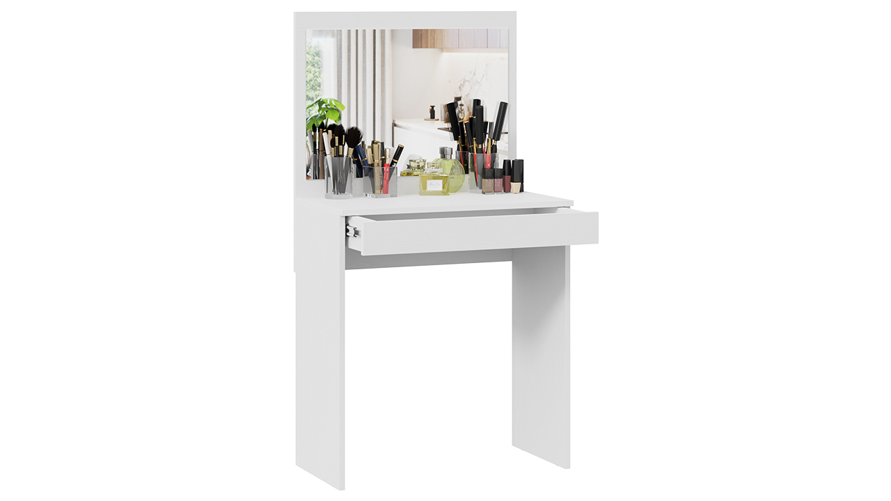 Несмотря на свои компактные размеры, туалетный стол имеет функциональный ящик с шариковыми направляющими для хранения парфюмерии, украшений и многого другого, достаточно вместительную столешницу, где можно разместить все необходимые аксессуары и полноценное зеркало. В этом туалетном столике нет ничего лишнего, только самое необходимое для уголка женской красоты.