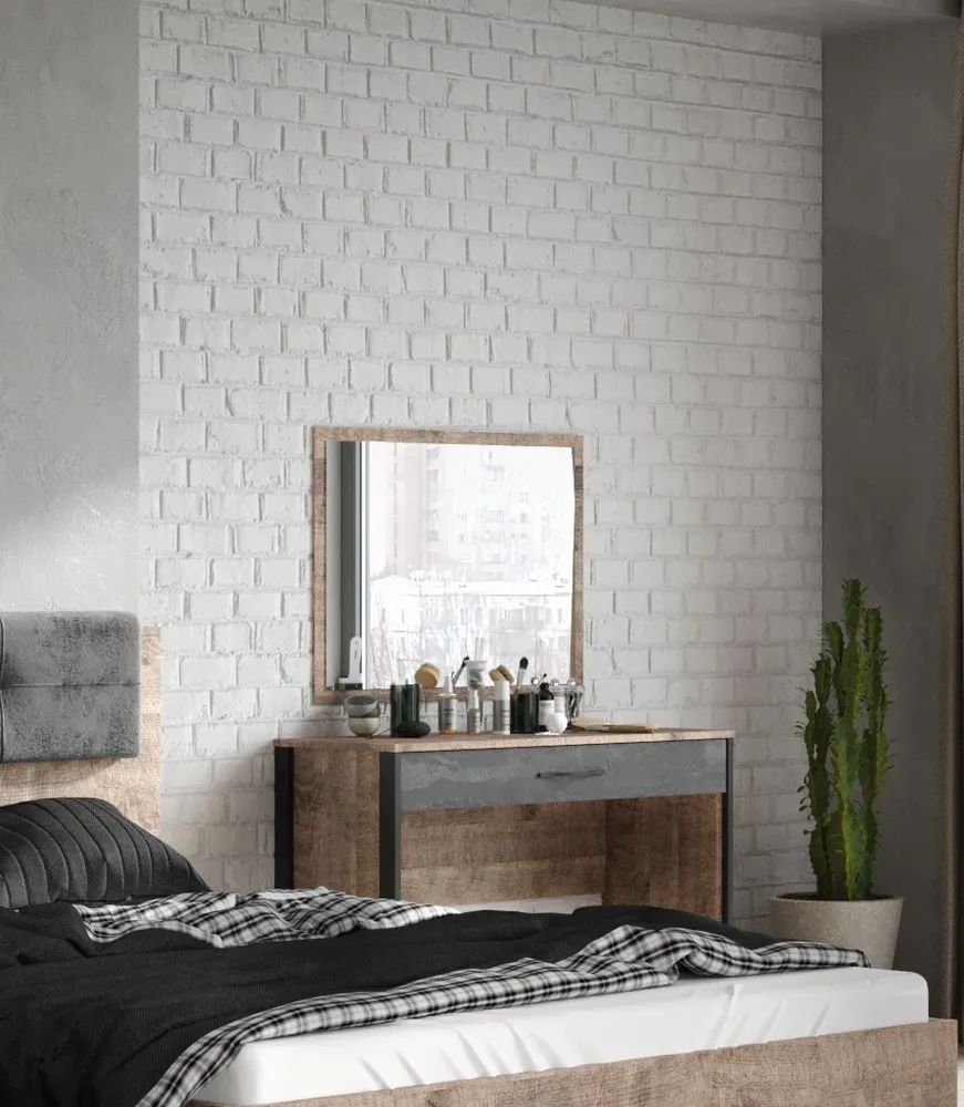 Ультрасовременное и нестандартное Hugo (Хьюго) Зеркало. Является дополнением к одноименному туалетному столу. Сочетание темного цвета железный камень и светлого дуб гранж смотрятся очень эффектно.