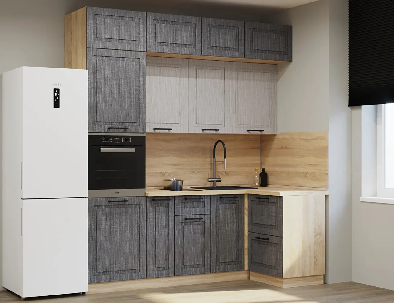 Аликанте 9: Цвет фасада: Шарли Pink, Шарли белый, корпус Серый, столешница 28мм: Каспий черный